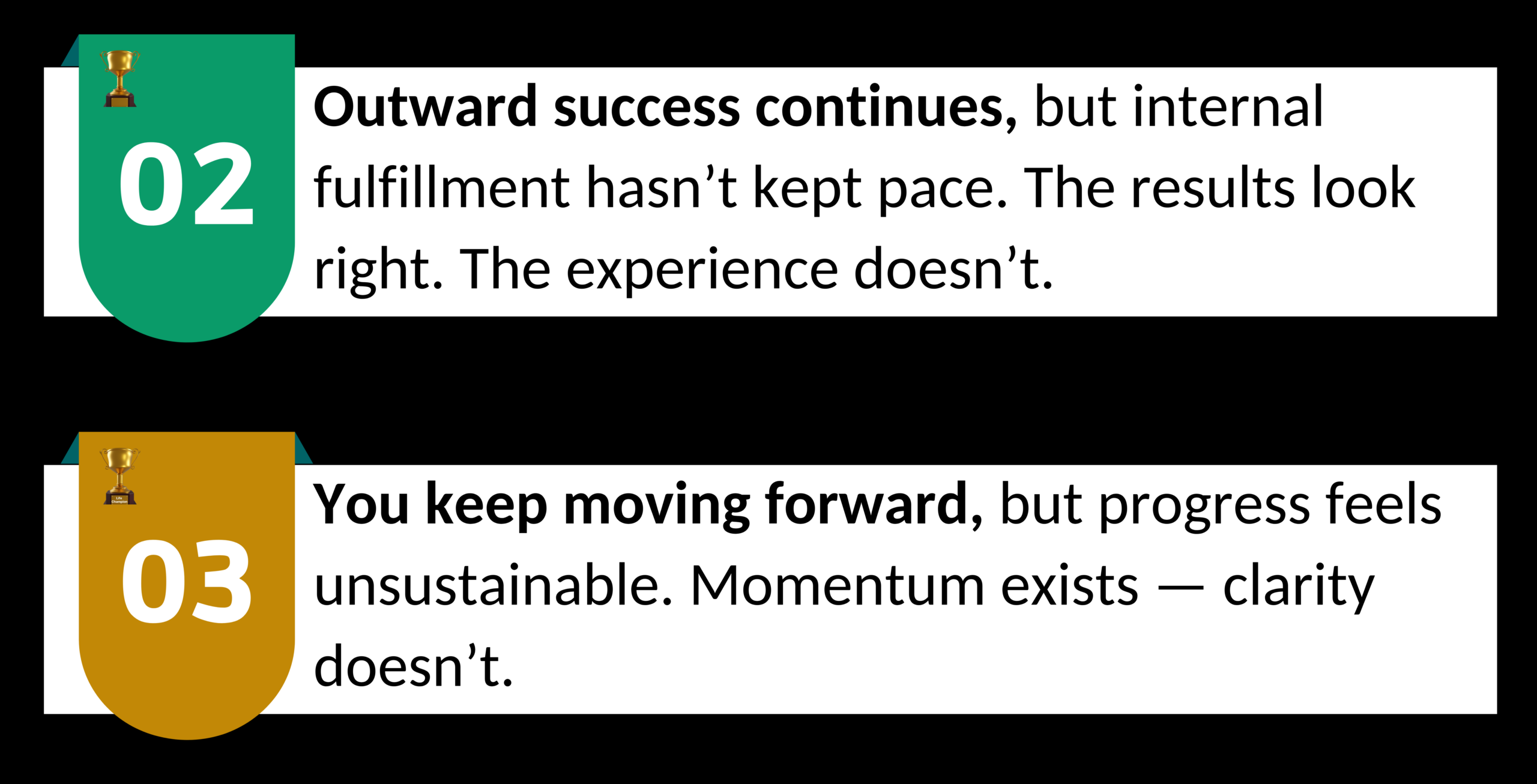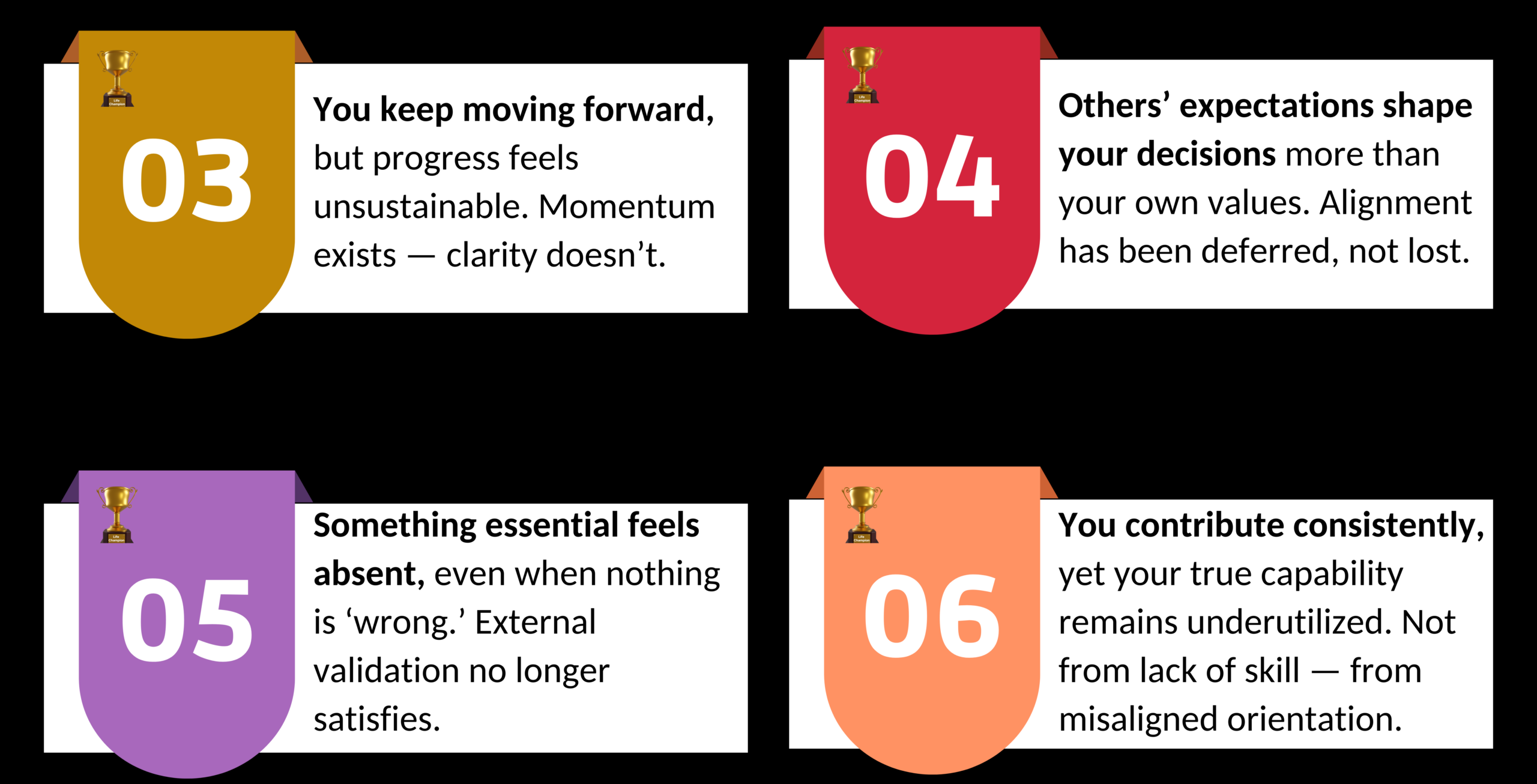 Lasting fulfillment isn’t created by doing more — it emerges when success is aligned with your inner authority. Calm restores power. When your goals express your deepest values, you don’t just achieve—you feel grounded and whole. When decisions are aligned, external results stabilize — not as rewards, but as byproducts of integrity. This isn’t a motivation problem. It’s an identity-alignment problem — and effort alone can’t resolve it.
